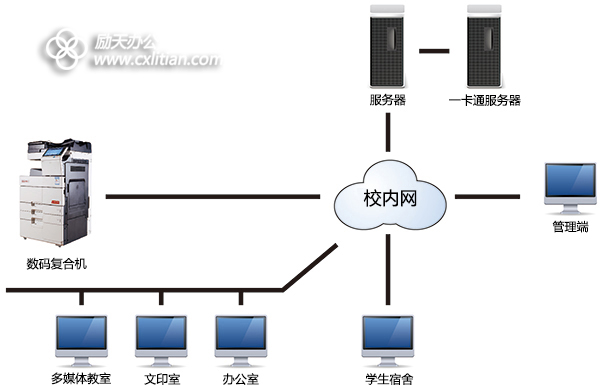通过校园一卡通进行身份认证和收费,做到使用者、使用时间、内容、费用的精确可控,在所有接入校园网的电脑上,为全校师生提供最方便最廉价的打印复印服务。