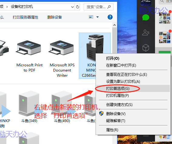 13、打印基本设置,在设备和打印机窗口中,选择刚刚安装的复印机,点击鼠标右键,选择“打印首选项”,在首选项窗口中,根据实际需求,选择是否需要双面打印,和彩色还是黑白打印。