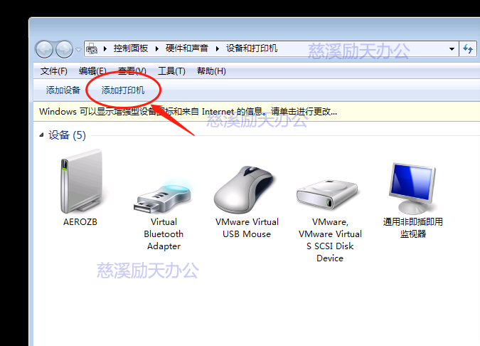 5、在设备和打印机窗口中,点击“添加打印机”,然后在添加打印机对话框中,点击“添加本地打印机”。