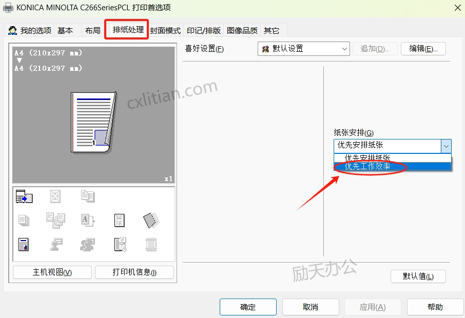 2、选择打印驱动首选项中“排纸处理”选项卡,将纸张安排改为“优先工作效率”(默认为“优先安排纸张”,PCL、PS、XPS都一样)