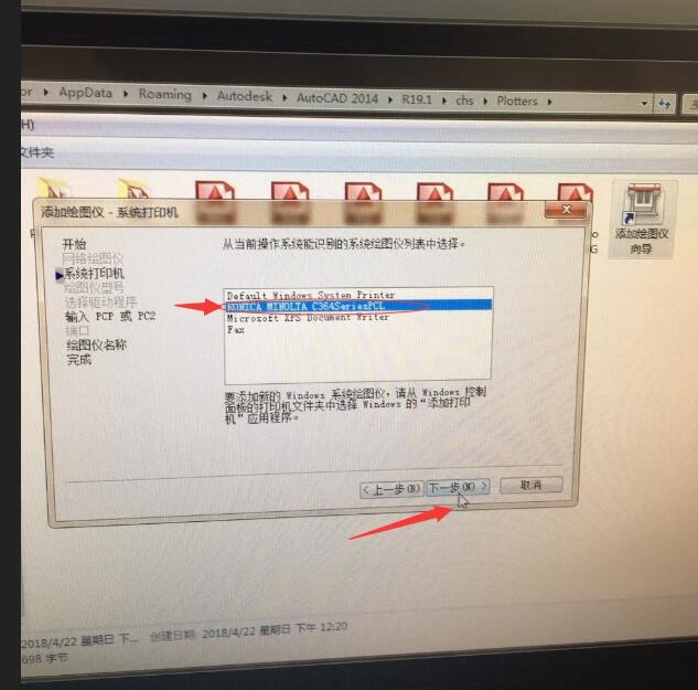 3、在添加绘图仪对话框中,选择最下面的“系统打印机”,然后选择下一步。