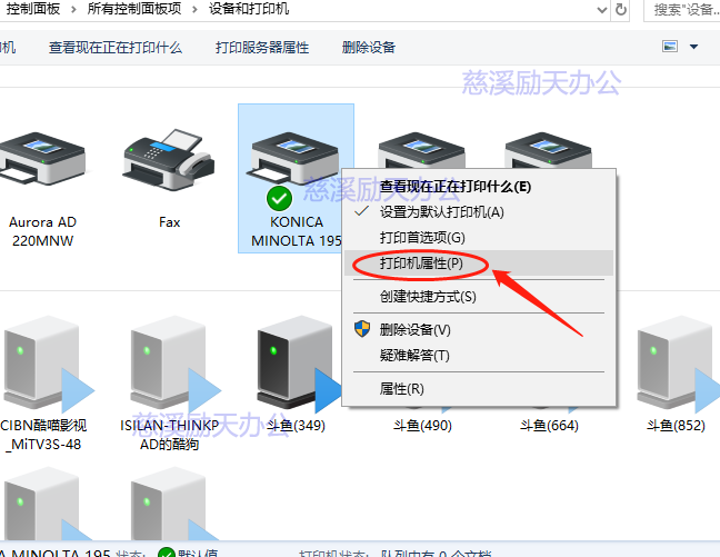 7、打印测试,在设备和打印机窗口中,选择刚刚安装的复印机,然后点击鼠标右键,选择“打印机属性”(XP系统选择“属性”)。
