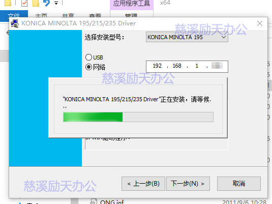 5、选择机器型号(可直接默认不选),点击网络选项,在后面的空格内依次输入机器的IP地址(机器IP地址可咨询复印机相关技术人员),输入完成后,点击“下一步”。