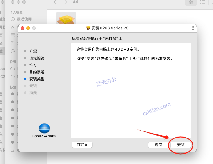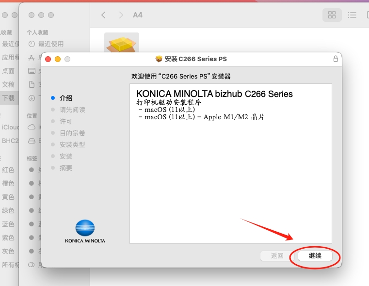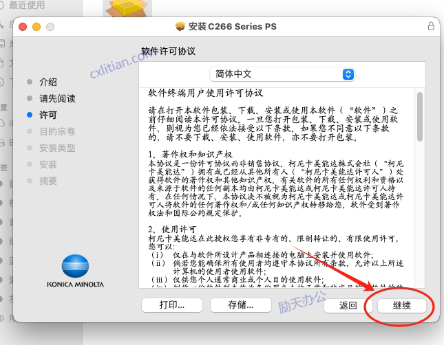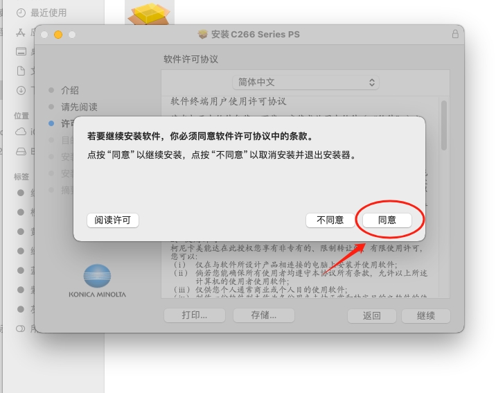 2、在弹出的安装对话框,持续点击右下角的“继续”,直到出现许可条约对话框,点击“同意”。