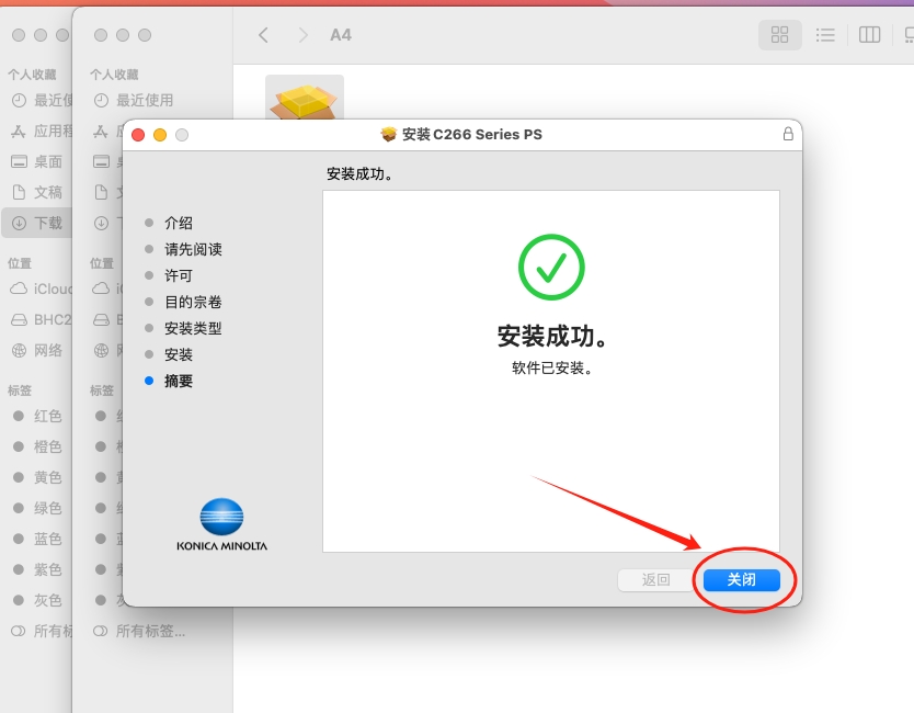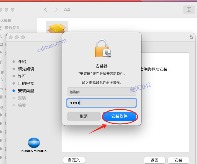 3、点击对话框右下角“安装”,在弹出的“安装器”对话框中输入系统用户名和密码后,点击“安装软件”,安装完成后点击“关闭”。
