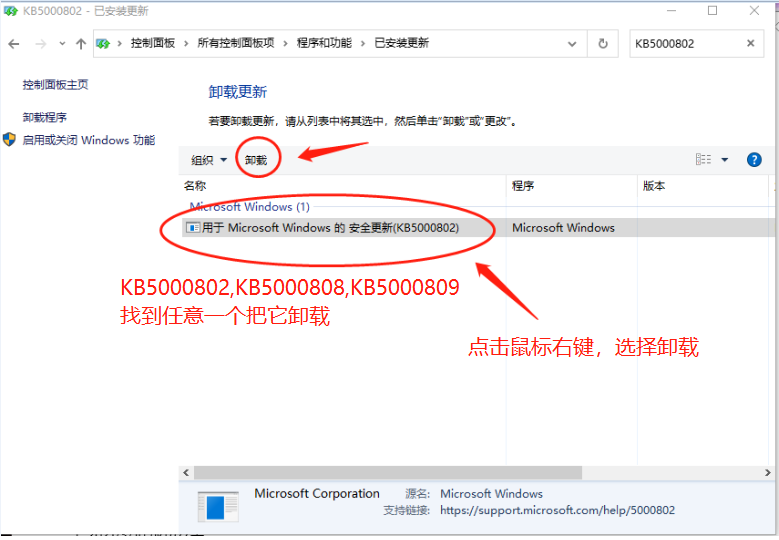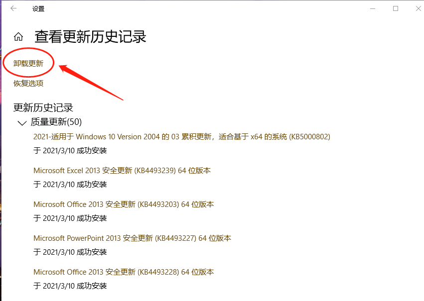 2、点击“查看更新历史记录”,选择“卸载更新”,查找“KB5000802”,“KB5000808”,“KB5000809”名称,右击选择“卸载”(三个更新补丁可能只有其中一个,找到哪个卸载哪个就行),等待卸载完成后(可能时间比较长,耐心等待),重启电脑即可打印测试。
